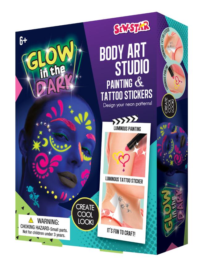 ✨ ¡Descubre la magia del arte corporal fluorescente con el set Glow in the Dark Body Art Studio de Sew Star! ✨ Diseña patrones únicos, pinta con colores que brillan en la oscuridad y agrega tatuajes luminosos para un look espectacular.